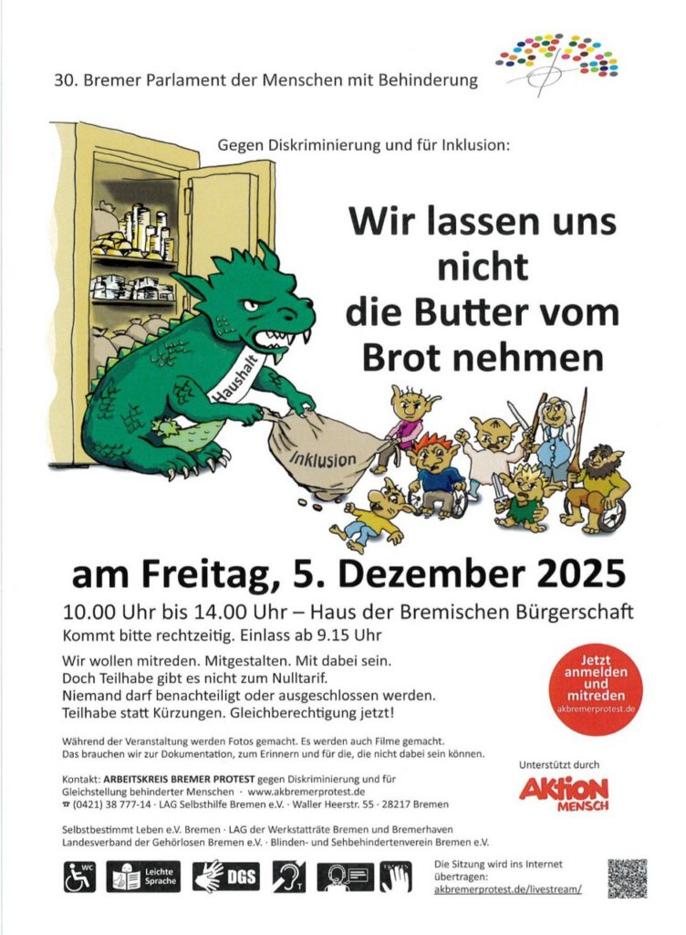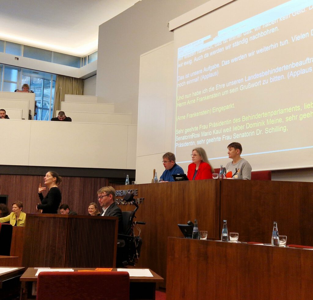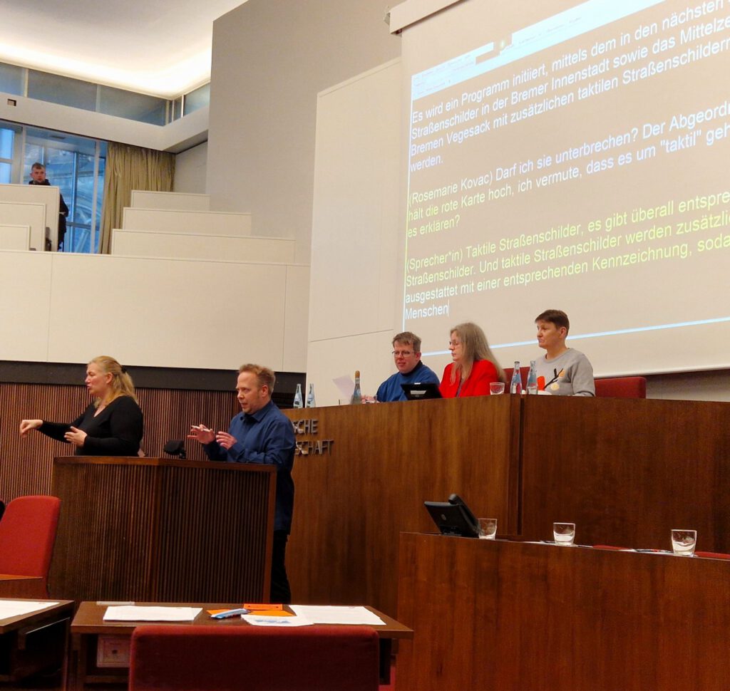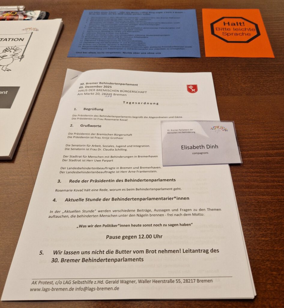 Beim diesjährigen 30. Bremer Behindertenparlament vom 5.12.2025 haben wir als „compagnons cooperative inklusiver film“ für eine Premiere gesorgt. Zum allersten Mal konnten Menschen, die nicht sehen können, die Beschlussvorschläge für das Behindertenparlament hören. Wir haben sie nämlich einsprechen lassen. Die positiven Rückmeldungen motivieren uns, weiterzumachen!